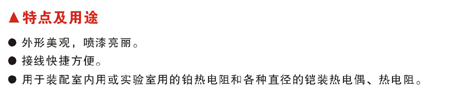 電線管與接線盒連接,線管里面的電線在接線盒中連起來,起到保護電線和連接電線的作用。熱電偶和熱電阻接線盒是用來固定接線座和作為連接器的裝置,它起著保護感溫元件免受外界氣氛侵蝕和使外接導線與接線柱接觸良好的作用,根據被測量溫度對象和現場環境條件及要求,除了普通型接線盒外,還有防濺型、防水型、防爆型、接插型、不銹鋼、塑料和一體化溫度變送器等接線盒。我們如果將各種類型的接線盒裝配成熱電偶和熱電阻產品,則這些產品相應即為防濺型、防水型和接插型等熱電偶和熱電阻了。