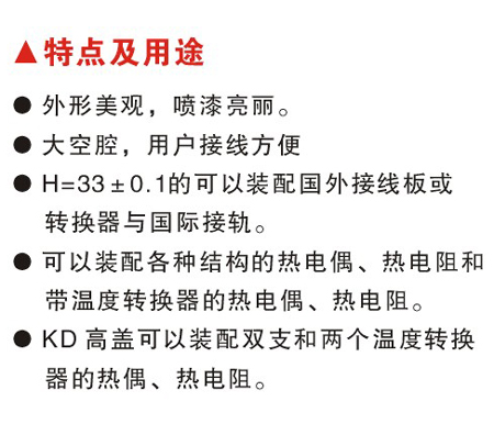 ●KD高蓋可以裝配雙支和兩個(gè)溫度轉(zhuǎn)換器的熱電偶、熱電阻。