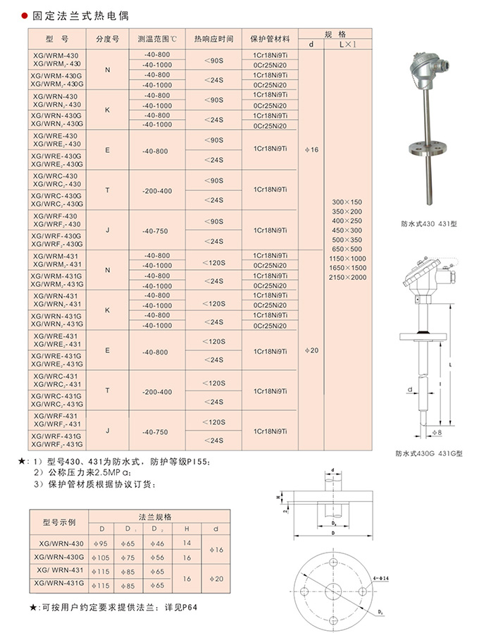 固定法蘭式裝配熱電偶作為一種溫度傳感器,通常和顯示儀表,記錄儀表和電子調節器配套使用。可以直接測量各種生產中從0℃到1300℃范圍的液體蒸汽和氣體介質以及固體的表面溫度。熱電偶通常由感溫元件、安裝固定裝置和接線盒等主要部件組成。是目前用量大的廉金屬熱電偶,其用量為其他熱電偶的總和。K型熱電偶絲直徑一般為1.2~4.0mm。正(KP)的名義化學成分為:Ni:Cr=92:12,負(KN)的名義化學成分為:Ni:Si=99:3,其使用溫度為-200~1300℃。