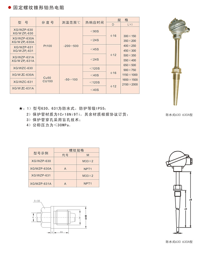 固定螺紋錐形裝配熱電阻,工業(yè)用裝配熱電阻作為溫度測量傳感器,通常顯示儀表、記錄儀和電子調(diào)節(jié)器等配套使用,它可以直接測量或控制各種生產(chǎn)過程中-200℃-600℃范圍內(nèi)的液體,蒸汽和氣體介質(zhì)以及固體表面的溫度。