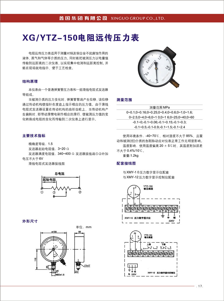電阻遠傳壓力表適用于測量對銅及銅合金不起腐蝕作用的液體、蒸汽和氣體等介質的壓力。同時能把被測壓力以電量值傳輸到遠距離的二次儀表,以實現集中檢 測和遠距離控制。并能在現場就地指示,便于工藝檢查。