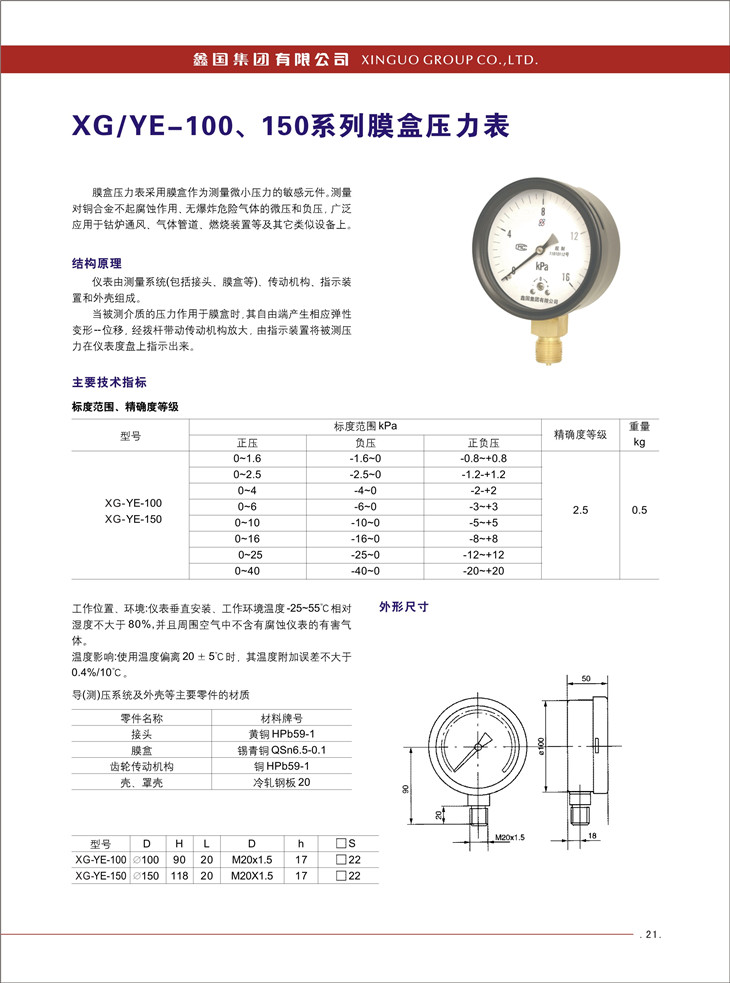 膜盒壓力表采用膜盒作為測量微小壓力的敏感元件,測量對銅合金不起腐蝕作用,無爆炸危險氣體的微壓和負壓。膜盒壓力表廣泛應用于鈷爐通風、氣體管道、燃燒裝置等及其它類似設備上。