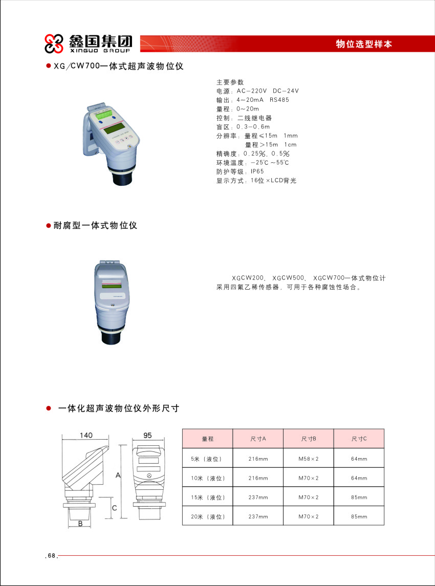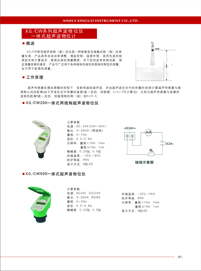 XG/CW 系列超聲波物位儀,一體式超聲波物位計。 XGCW 系列超聲波物(液)位儀是一種智能型非接觸式物(液)位測量儀表,產品具有自動功率調整,增益控制,溫度補償,采用先進的檢 測技術和計算技術,提高儀表的測量精度,對干擾回波有抑制功能,保證測量結果的真實。超聲波物位儀可廣泛用于各種液體的液位和固體的物位的測量。
